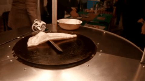 Mis au point par les ingénieux copains de Maus Robotics (deux frères basés à Bâle), le « robot à crêpes compact » permet de préparer des crêpes « en 90 secondes ». Toujours « propre et savoureux », comme l'expliquent les frangins, et plus rapide qu’un humain en plus ! Que demande le peuple ? Probablement un robot qui fait tout type de plat (et pas juste des crêpes), et notamment des omelettes… Pareil, ça existe déjà ! Sorry Moravec.