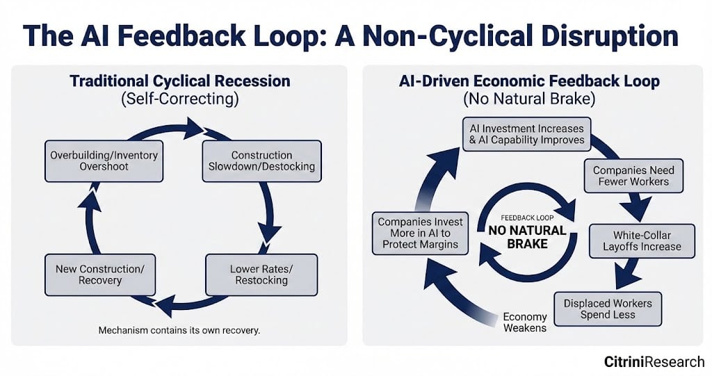 La « destruction non-créatrice », ça vous parle ? C’est avec ce twist schumpétérien que le cabinet de conseil Citrini a créé un buzz sans précédent chez les économistes et un vrai coup de panique à Wall Street. À la base, c’était surtout un joli coup de pub : il y a quelques jours, le fondateur de Citrini Research James van Geelen publie une note de fiction économique rédigée comme si nous étions en 2028. Jusque-là rien d’exceptionnel : ce n’est pas la première fois que des consultants ou autres prospectivistes s’imaginent l’économie à 5, 10 ou 20 ans, à grand renfort de robotisation généralisée et de puces dans le cerveau (n’est ce pas, Laurent Alexandre ?). Sauf que le scénario de van Geelen a fait flipper tout le monde, vu qu’il met en scène une boucle de rétroaction dans laquelle, à force de remplacer les cols blancs par des agents IA toujours plus compétents, les entreprises finissent par faire plonger les revenus, casser la consommation, fragiliser l’immobilier, le crédit privé, l’assurance-vie en mettant, in fine, l’économie tout entière dans une sacrée panade.