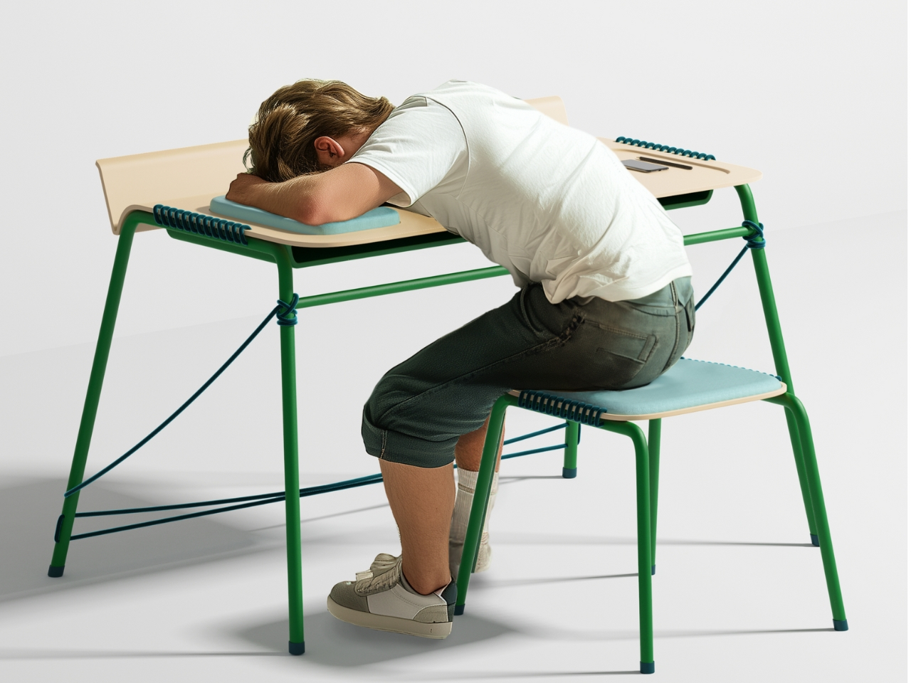 Ils sont cinq à avoir conçu cette petite merveille – on se demande pourquoi il a fallu s’y mettre à cinq pour repenser un bureau en y ajoutant un coussin (histoire de poser sa tête), et tirer quelques cordes en dessous pour ne pas avoir les jambes qui traînent par terre… Bref : rien de folichon, si ce n’est un joli design épuré et un nom à nous donner envie de bailler et de se caler dans un coin sans déranger personne, à la Elon… Alors, vous avez sommeil ?
